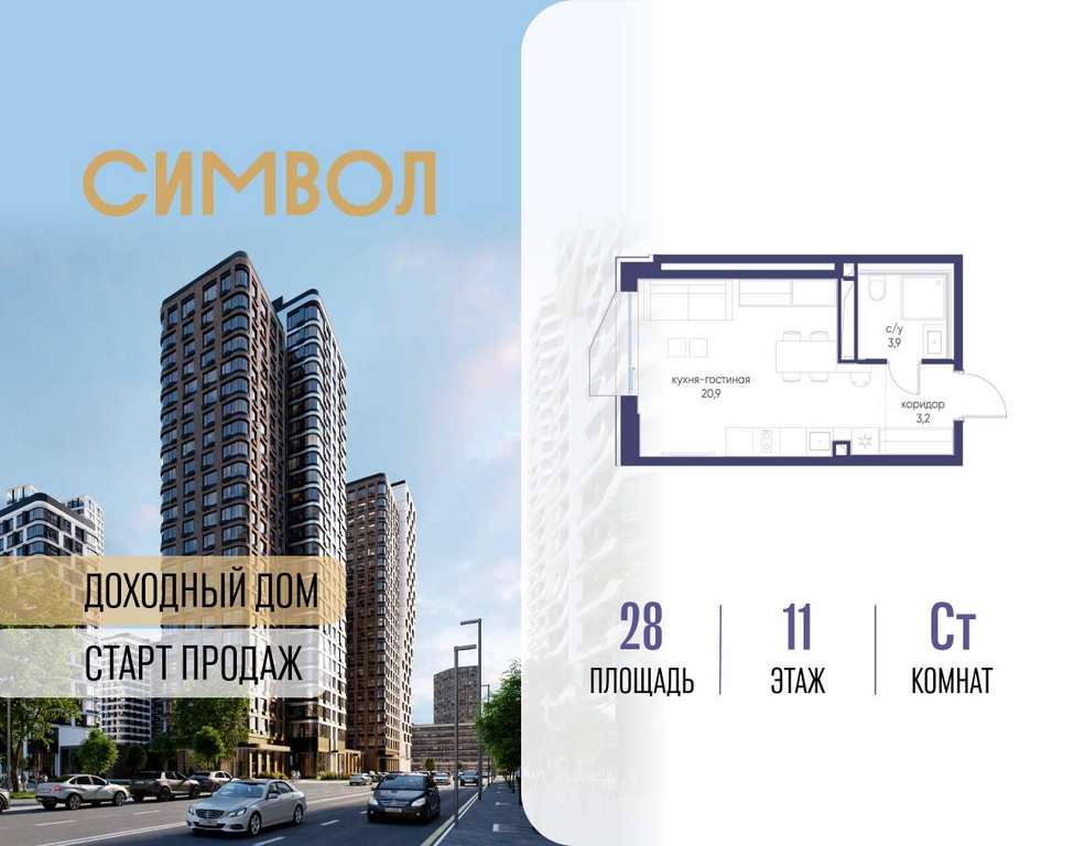 Продается квартира-студия от застройщика: общая площадь 28.00 м, жилая 15.90 м, кухня 5.00 м, 11-й этаж, жилой квартал «Гордость», корпус 40 (секция 1) . Срок сдачи: 2 квартал 2029 года.