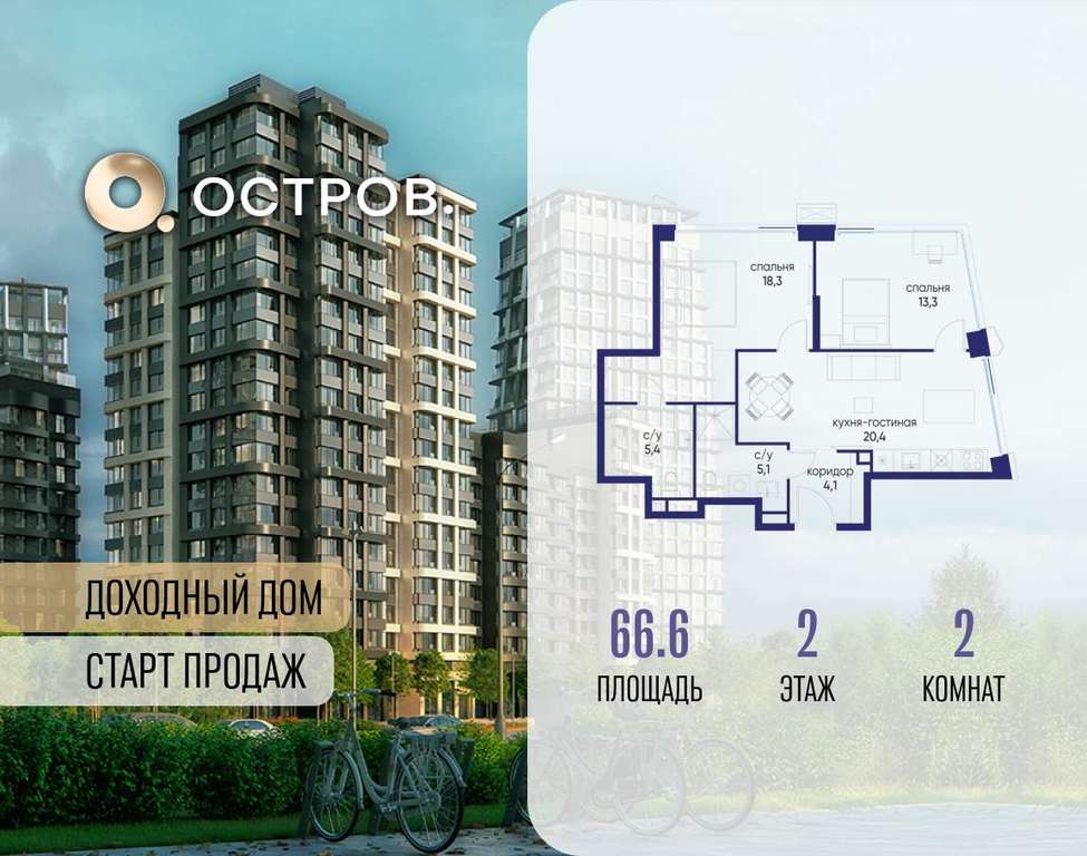 Продаётся 2-комн. квартира от застройщика: общая площадь 66.60 м, жилая 31.60 м, кухня 20.40 м, 2-й этаж, жилой квартал «Остров 14», корпус 6 (секция 1) . Срок сдачи: 2 квартал 2029 года.
