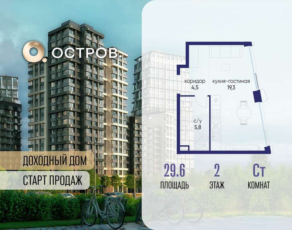 Продаётся квартира от застройщика: общая площадь 29.60 м, жилая 14.30 м, кухня 5.00 м, 2-й этаж, жилой квартал «Остров 14», корпус 6 (секция 1) . Срок сдачи: 2 квартал 2029 года.