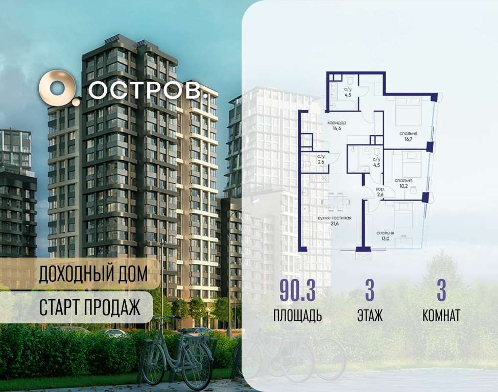 Продаётся 3-комн. квартира от застройщика: общая площадь 90.30 м, жилая 39.90 м, кухня 21.60 м, 3-й этаж, жилой квартал «Остров 14», корпус 6 (секция 1) . Срок сдачи: 2 квартал 2029 года.