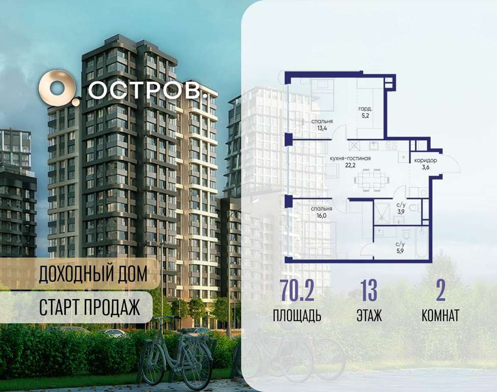 Продаётся 2-комн. квартира от застройщика: общая площадь 70.20 м, жилая 29.40 м, кухня 22.20 м, 13-й этаж, жилой квартал «Остров 14», корпус 6 (секция 1) . Срок сдачи: 2 квартал 2029 года.