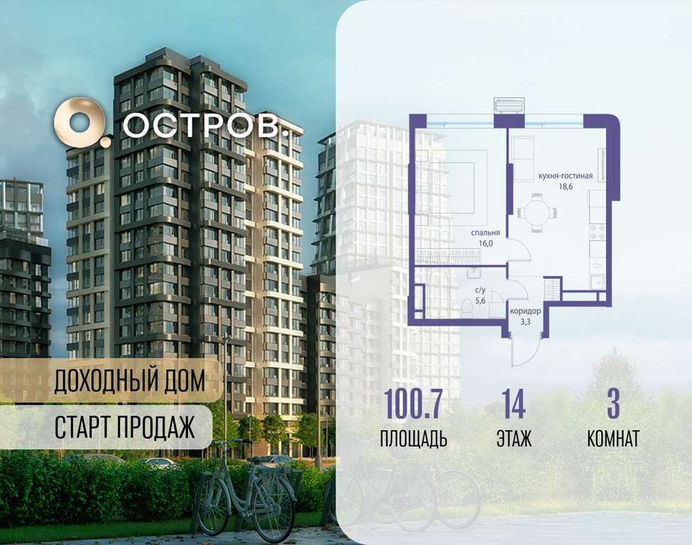 Продаётся 3-комн. квартира от застройщика: общая площадь 100.70 м, жилая м, кухня м, 14-й этаж, жилой квартал «Остров 14», корпус 6 (секция 1) . Срок сдачи: 2 квартал 2029 года.