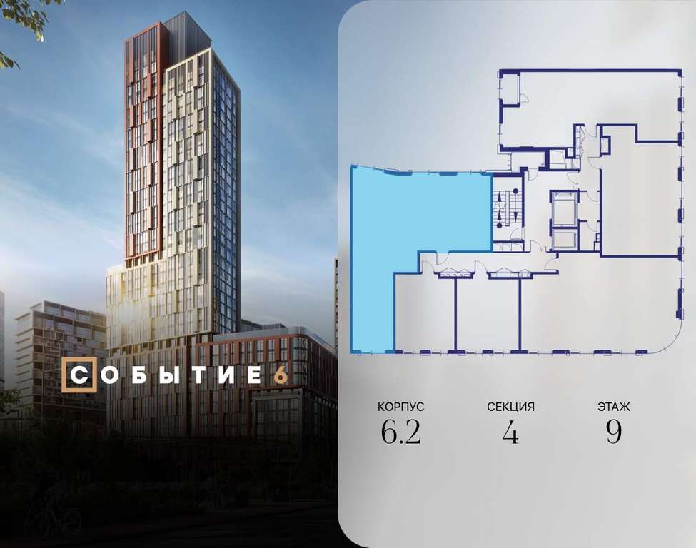 Продаётся 3-комнатная квартира от застройщика: общая площадь 108.90 м, жилая 42.40 м, кухня 23.30 м, 9-й этаж, жилой квартал «Событие-6», корпус 2 (секция 4) Срок сдачи: 1 квартал 2029 года.