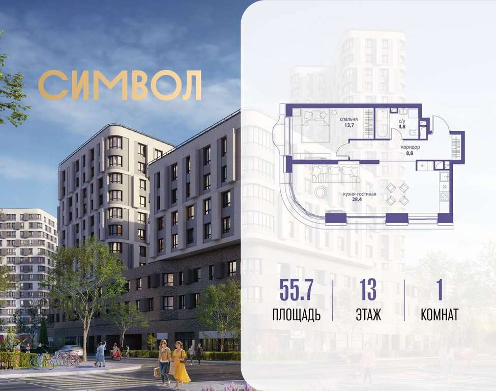 Продается 1-комнатная квартира от застройщика: общая площадь 55.70 м, жилая 13.70 м, кухня 28.40 м, 13-й этаж, жилой квартал «Вдохновение», корпус 35 (секция 1) . Срок сдачи: 4 квартал 2027 года.