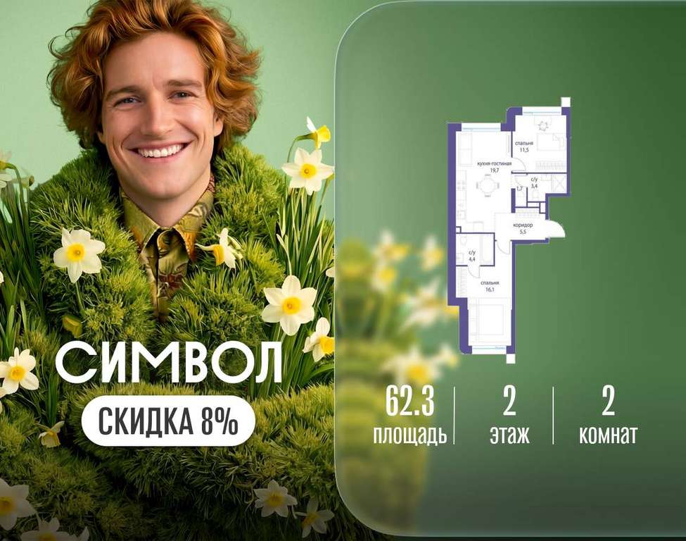Продается 2-комнатная квартира от застройщика: общая площадь 62.30 м, жилая 27.60 м, кухня 19.70 м, 2-й этаж, жилой квартал «Гордость», корпус 36 (секция 5) . Срок сдачи: 2 квартал 2029 года.