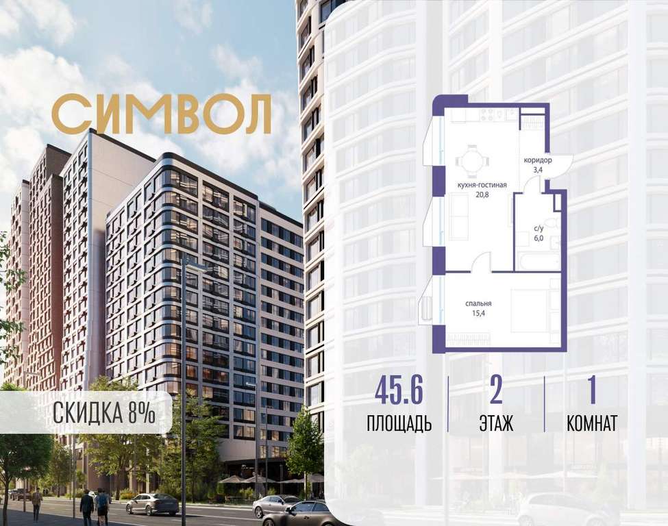Продается 1-комнатная квартира от застройщика: общая площадь 45.60 м, жилая 15.40 м, кухня 20.80 м, 2-й этаж, жилой квартал «Гордость», корпус 36 (секция 1) . Срок сдачи: 2 квартал 2029 года.