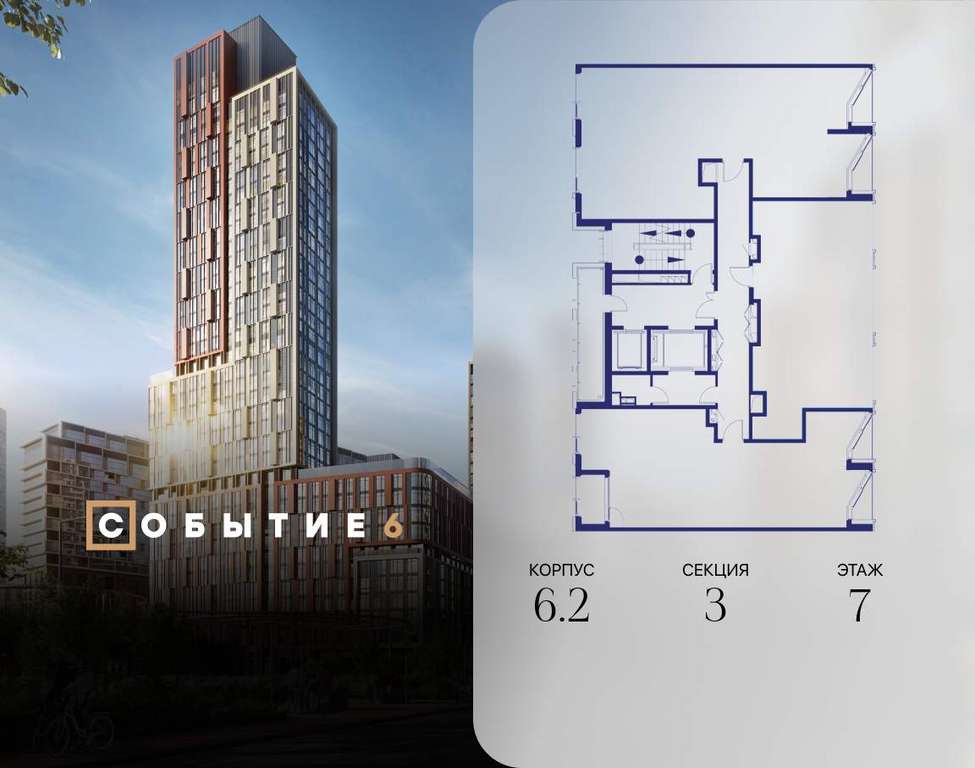 Продаётся 1-комнатная квартира от застройщика: общая площадь 59.10 м, жилая 16.10 м, кухня 26.90 м, 7-й этаж, жилой квартал «Событие-6», корпус 2 (секция 3) Срок сдачи: 1 квартал 2029 года.