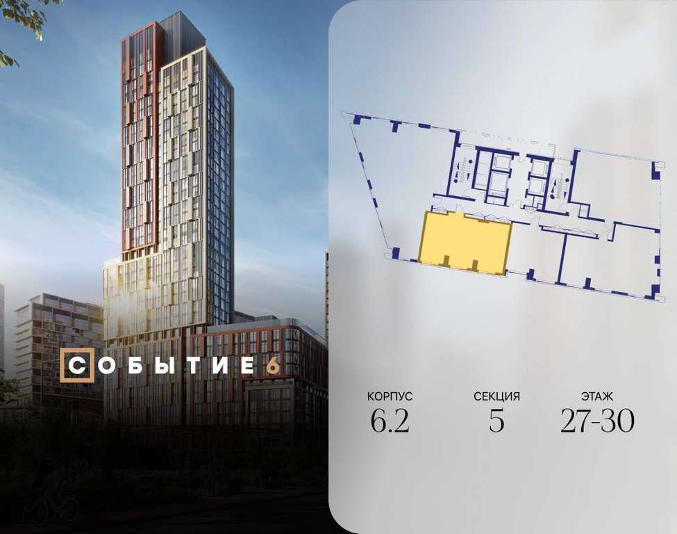 Продаётся 2-комнатная квартира от застройщика: общая площадь 61.80 м, жилая 32.90 м, кухня 17.80 м, 30-й этаж, жилой квартал «Событие-6», корпус 2 (секция 5) Срок сдачи: 1 квартал 2029 года.