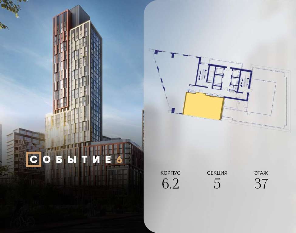 Продаётся 2-комнатная квартира от застройщика: общая площадь 62.10 м, жилая 33.00 м, кухня 17.80 м, 37-й этаж, жилой квартал «Событие-6», корпус 2 (секция 5) Срок сдачи: 1 квартал 2029 года.