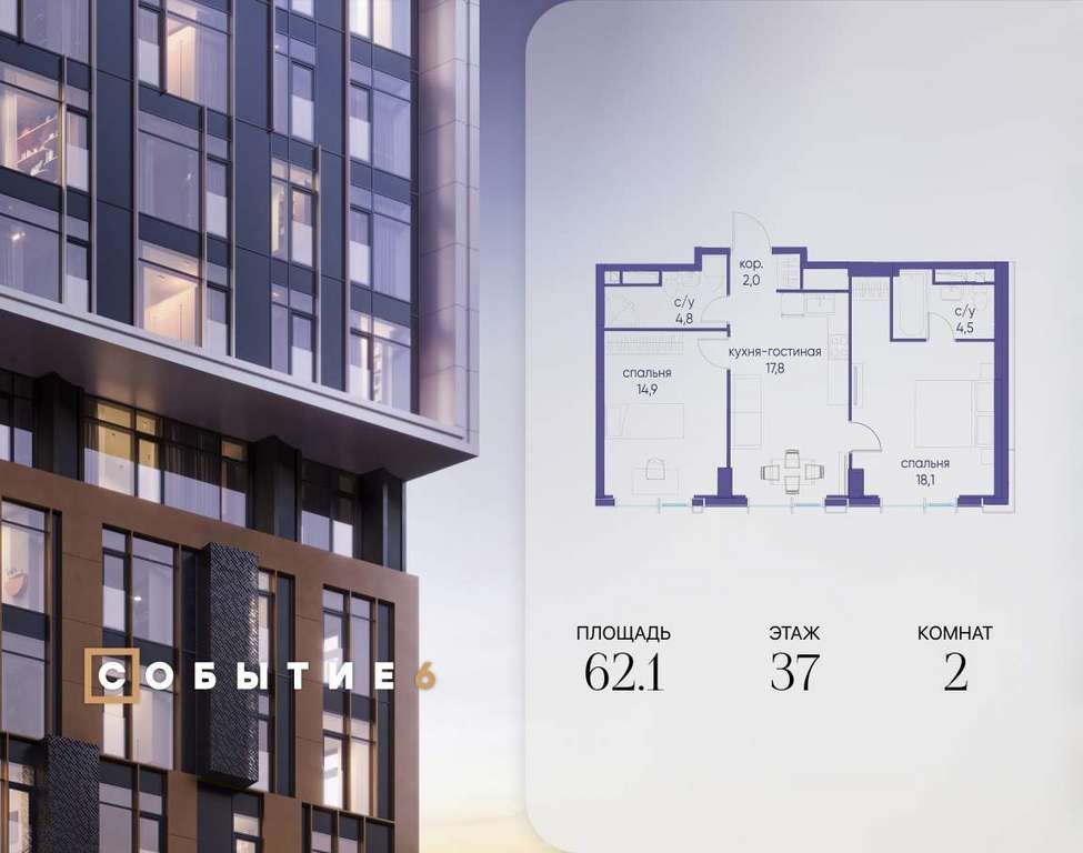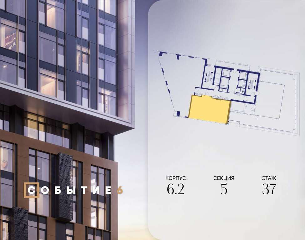 Продаётся 2-комнатная квартира от застройщика: общая площадь 62.10 м, жилая 33.00 м, кухня 17.80 м, 37-й этаж, жилой квартал «Событие-6», корпус 2 (секция 5) Срок сдачи: 4 квартал 2029 года.