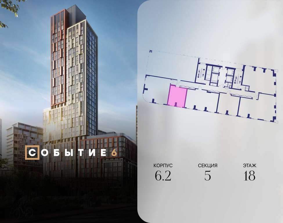 Продаётся квартира-студия от застройщика: общая площадь 31.70 м, жилая 20.30 м, кухня 5.00 м, 18-й этаж, жилой квартал «Событие-6», корпус 2 (секция 5) Срок сдачи: 1 квартал 2029 года.