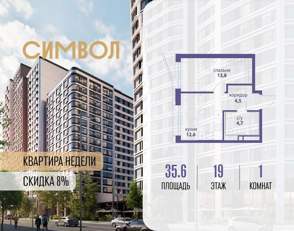 Продается 1-комнатная квартира от застройщика: общая площадь 35.60 м, жилая 13.80 м, кухня 12.60 м, 19-й этаж, жилой квартал «Вдохновение», корпус 33 (секция 3) . Срок сдачи: 4 квартал 2027 года.