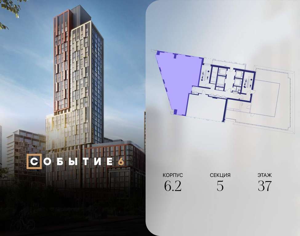Продаётся 4-комнатная квартира от застройщика: общая площадь 131.10 м, жилая 60.20 м, кухня 28.30 м, 37-й этаж, жилой квартал «Событие-6», корпус 2 (секция 5) Срок сдачи: 1 квартал 2029 года.