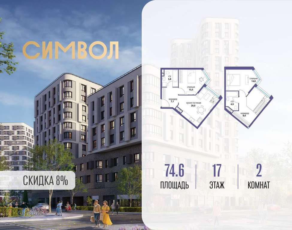Продается 2-комнатная квартира от застройщика: общая площадь 74.60 м, жилая 28.30 м, кухня 20.00 м, 17-й этаж, жилой квартал «Вдохновение», корпус 28 (секция 1) . Срок сдачи: 4 квартал 2025 года.
