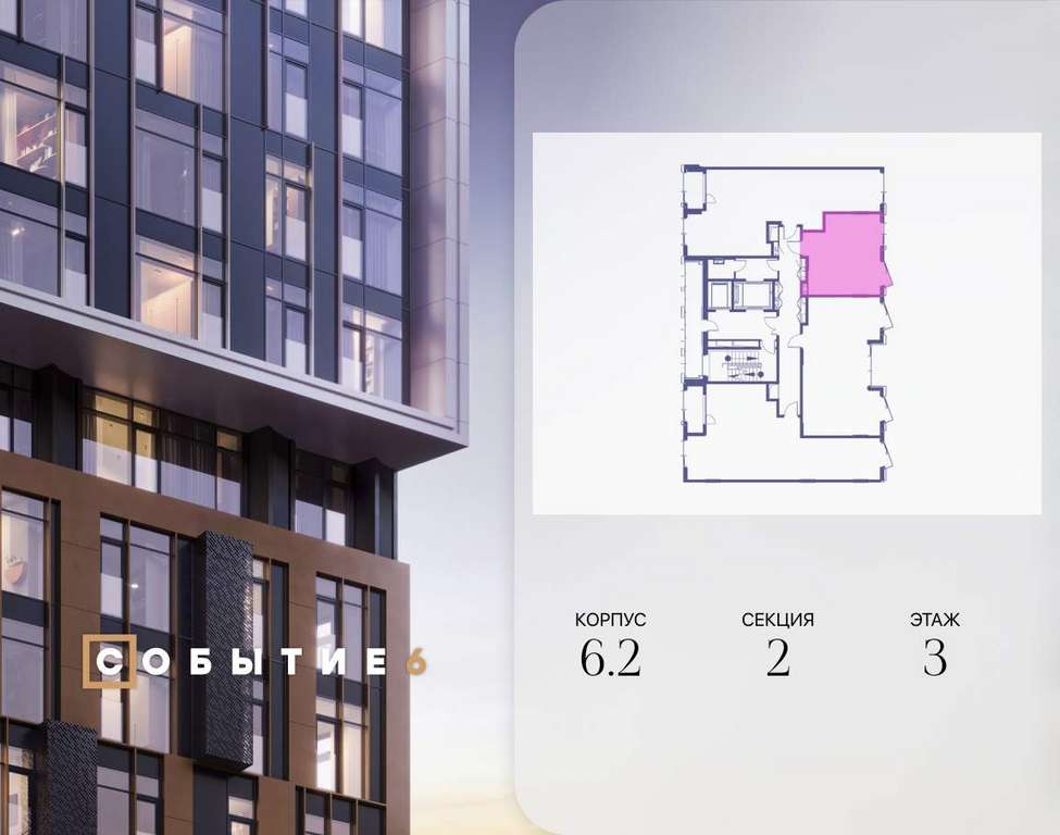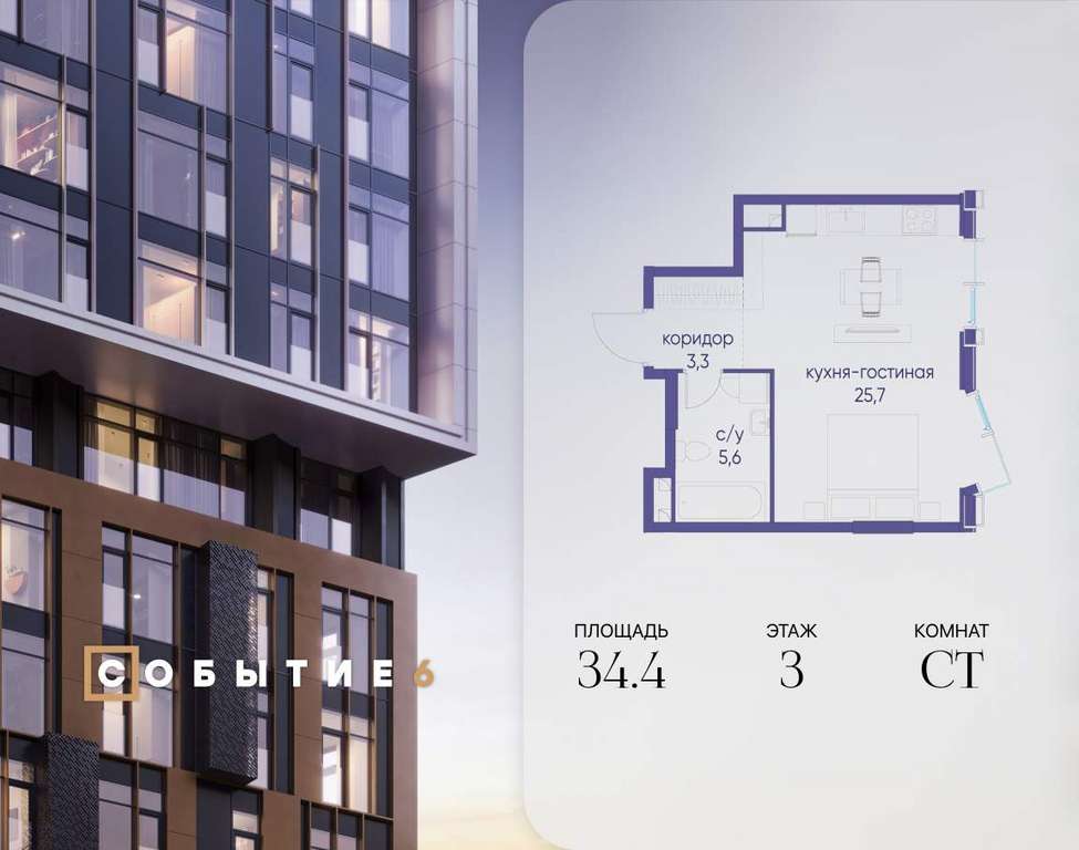 Продаётся квартира-студия от застройщика: общая площадь 34.40 м, жилая 20.70 м, кухня 5.00 м, 3-й этаж, жилой квартал «Событие-6», корпус 2 (секция 2) Срок сдачи: 4 квартал 2029 года.