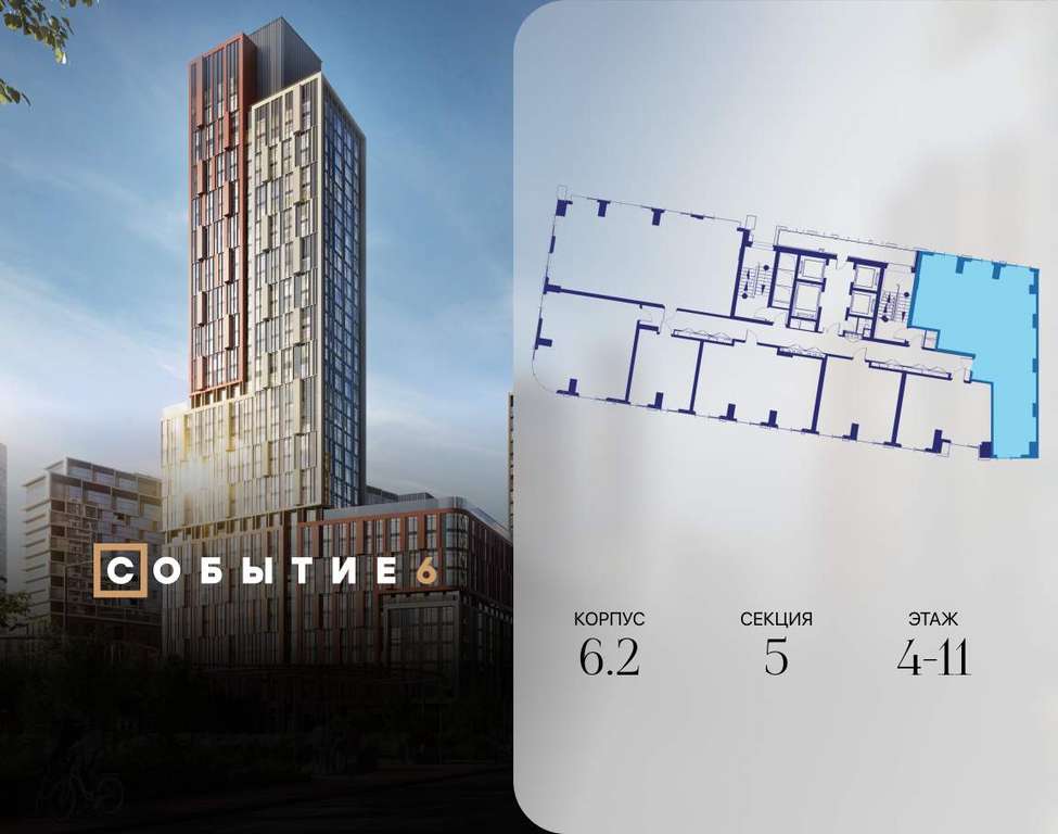 Продаётся 3-комнатная квартира от застройщика: общая площадь 107.50 м, жилая 35.20 м, кухня 30.00 м, 9-й этаж, жилой квартал «Событие-6», корпус 2 (секция 5) Срок сдачи: 1 квартал 2029 года.