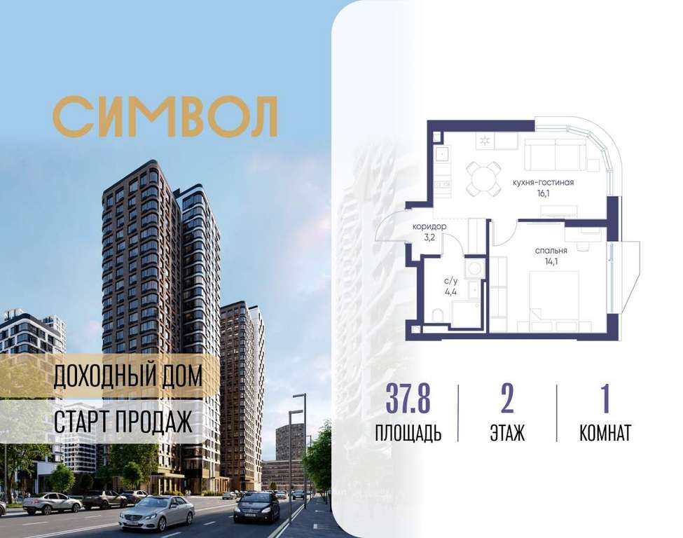 Продается 1-комнатная квартира от застройщика: общая площадь 37.80 м, жилая 14.10 м, кухня 16.10 м, 2-й этаж, жилой квартал «Гордость», корпус 40 (секция 1) . Срок сдачи: 2 квартал 2029 года.