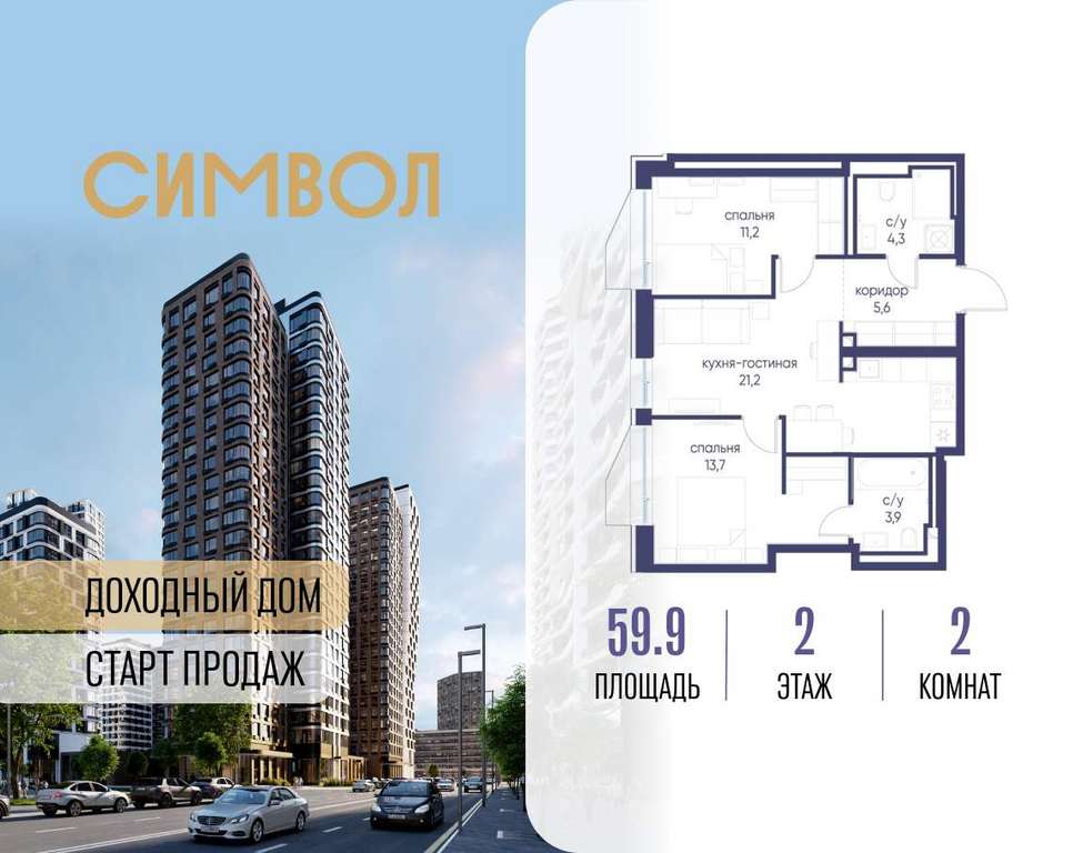 Продается 2-комнатная квартира от застройщика: общая площадь 59.90 м, жилая 24.90 м, кухня 21.20 м, 2-й этаж, жилой квартал «Гордость», корпус 40 (секция 1) . Срок сдачи: 2 квартал 2029 года.