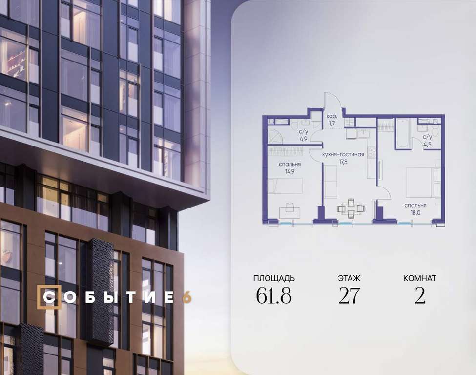 Продаётся 2-комнатная квартира от застройщика: общая площадь 61.80 м, жилая 32.90 м, кухня 17.80 м, 27-й этаж, жилой квартал «Событие-6», корпус 2 (секция 5) Срок сдачи: 4 квартал 2029 года.