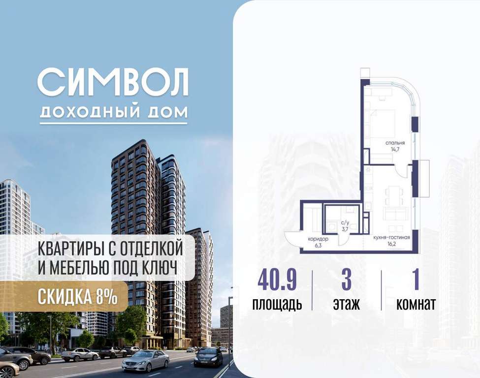 Продается 1-комнатная квартира от застройщика: общая площадь 40.90 м, жилая 14.70 м, кухня 16.20 м, 3-й этаж, жилой квартал «Гордость», корпус 40 (секция 1) . Срок сдачи: 2 квартал 2029 года.