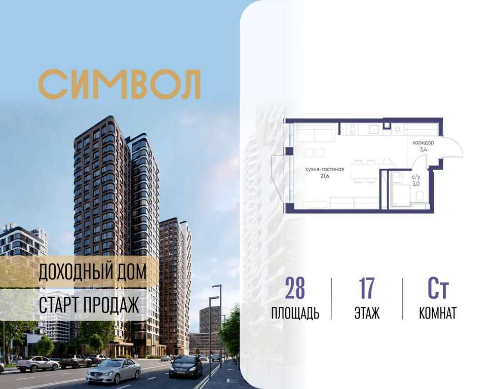 Продается квартира-студия от застройщика: общая площадь 28.00 м, жилая 15.90 м, кухня 5.00 м, 17-й этаж, жилой квартал «Гордость», корпус 40 (секция 1) . Срок сдачи: 2 квартал 2029 года.