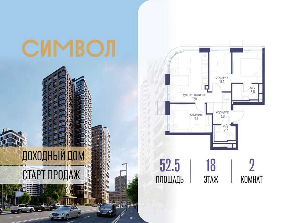 Продается 2-комнатная квартира от застройщика: общая площадь 52.50 м, жилая 24.70 м, кухня 17.80 м, 18-й этаж, жилой квартал «Гордость», корпус 40 (секция 1) . Срок сдачи: 2 квартал 2029 года.