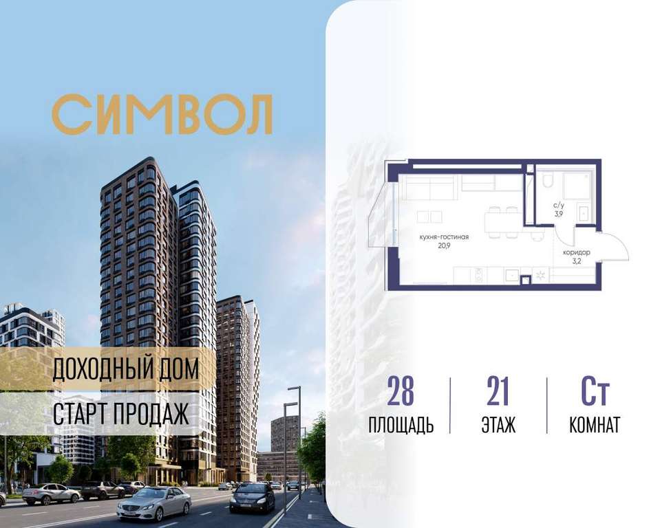 Продается квартира-студия от застройщика: общая площадь 28.00 м, жилая 15.90 м, кухня 5.00 м, 21-й этаж, жилой квартал «Гордость», корпус 40 (секция 1) . Срок сдачи: 2 квартал 2029 года.