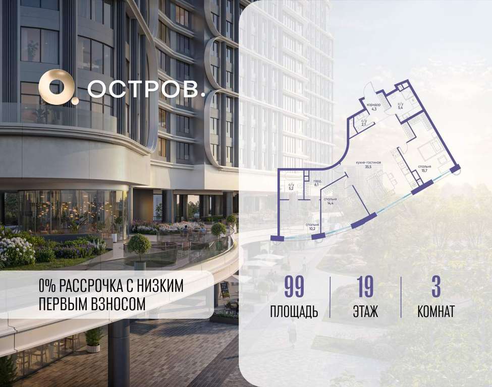 ОСТРОВ от Донстрой - жилой комплекс на западе Москвы, в Мневниковской пойме. Уникальное преимущество комплекса - в том, что он обособлен от города рекой и природным парком (650 га) . Благодаря природному окружению эта территория имеет лучший экологический рейтинг в столице. Кварталы ОСТРОВА объединены ландшафтным дизайном в единое пространство - с набережными и Центральным бульваром. На ОСТРОВЕ любые объекты, необходимые для полноценной жизни и отдыха, находятся на расстоянии 15-минутной прогулки. Торговый центр и супермаркеты, кафе и рестораны, фитнес, салоны красоты, школы и детские сады. А также крупнейший в Москве спортивный кластер.