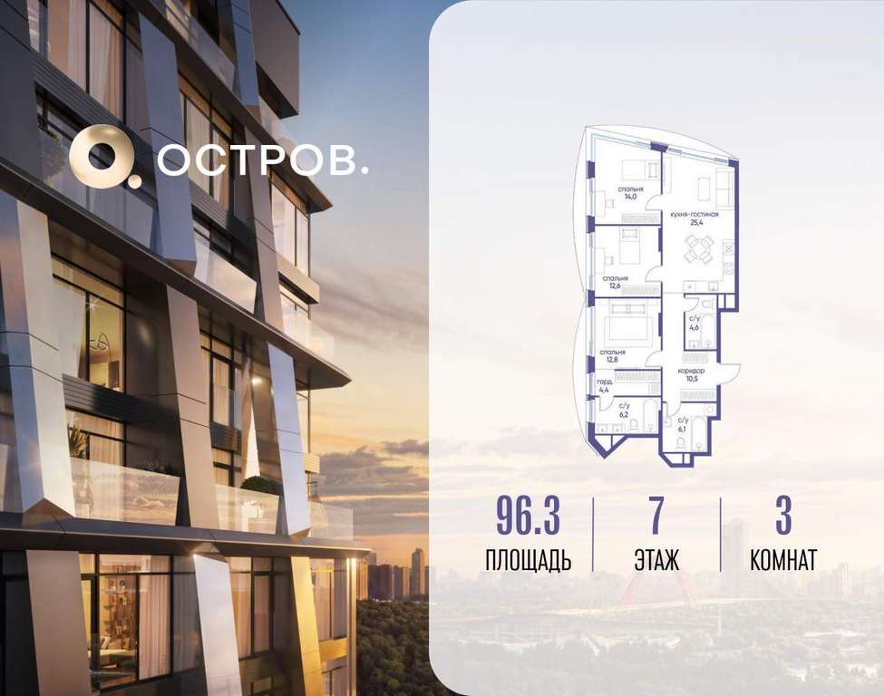 Продаётся 3-комн. квартира от застройщика: общая площадь 96.30 м, жилая 39.40 м, кухня 25.40 м, 7-й этаж, жилой квартал «Остров 12», корпус 4 (секция 1) . Срок сдачи: 1 квартал 2029 года.