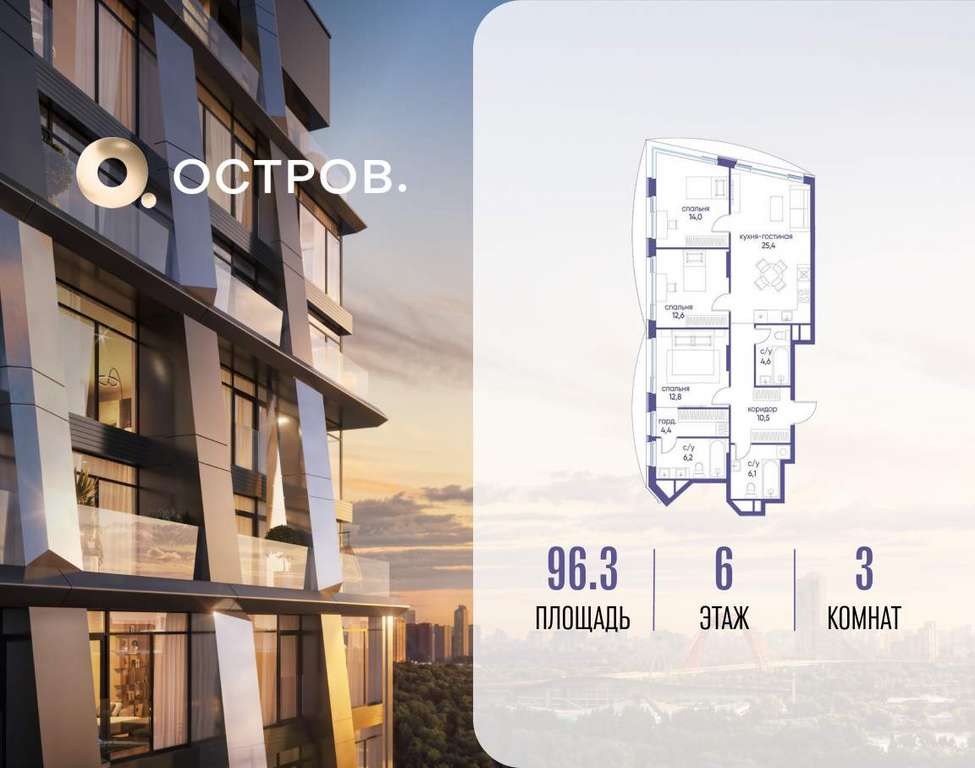 Продаётся 3-комн. квартира от застройщика: общая площадь 96.30 м, жилая 39.40 м, кухня 25.40 м, 6-й этаж, жилой квартал «Остров 12», корпус 4 (секция 1) . Срок сдачи: 1 квартал 2029 года.