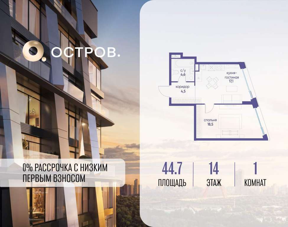 Продаётся 1-комн. квартира от застройщика: общая площадь 44.70 м, жилая 18.50 м, кухня 17.10 м, 14-й этаж, жилой квартал «Остров 12», корпус 1 (секция 2) . Срок сдачи: 1 квартал 2029 года.