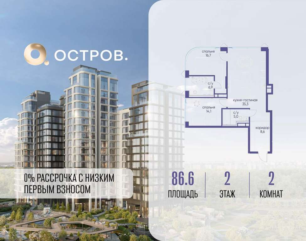 Продаётся 2-комн. квартира от застройщика: общая площадь 86.60 м, жилая 30.80 м, кухня 35.30 м, 2-й этаж, жилой квартал «Остров 12», корпус 2 (секция 2) . Срок сдачи: 1 квартал 2029 года.