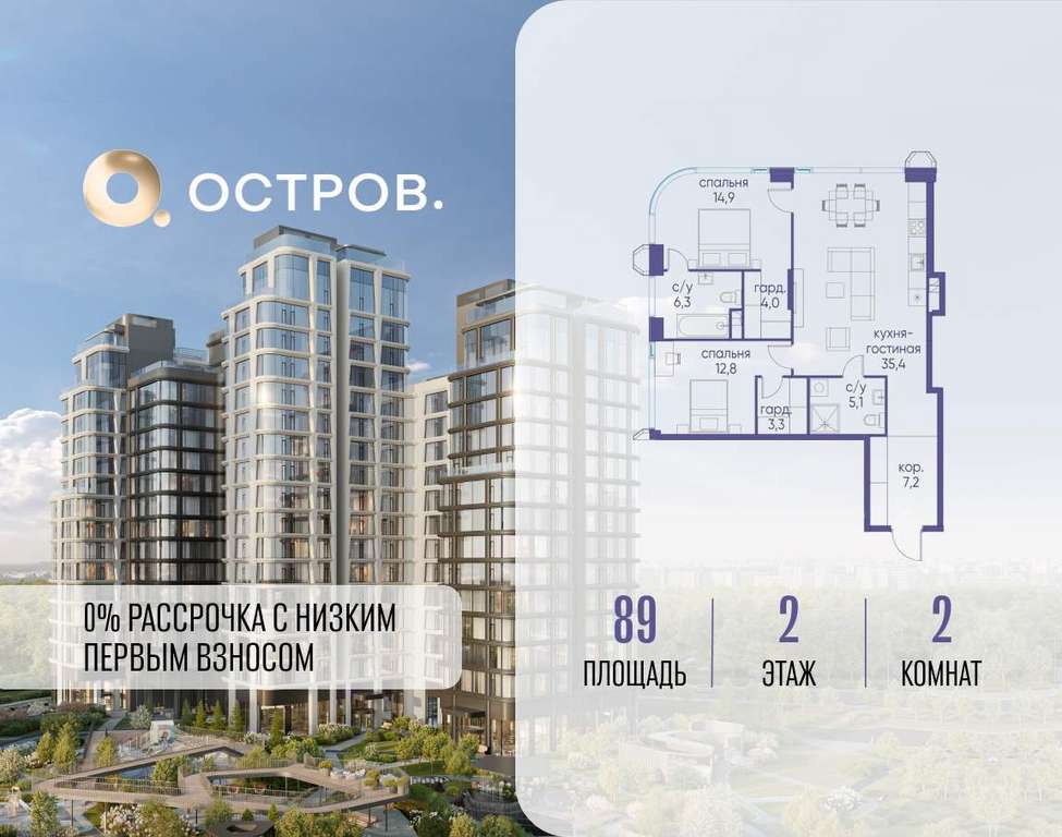 Продаётся 2-комн. квартира от застройщика: общая площадь 89.00 м, жилая 27.70 м, кухня 35.40 м, 2-й этаж, жилой квартал «Остров 12», корпус 1 (секция 2) . Срок сдачи: 1 квартал 2029 года.