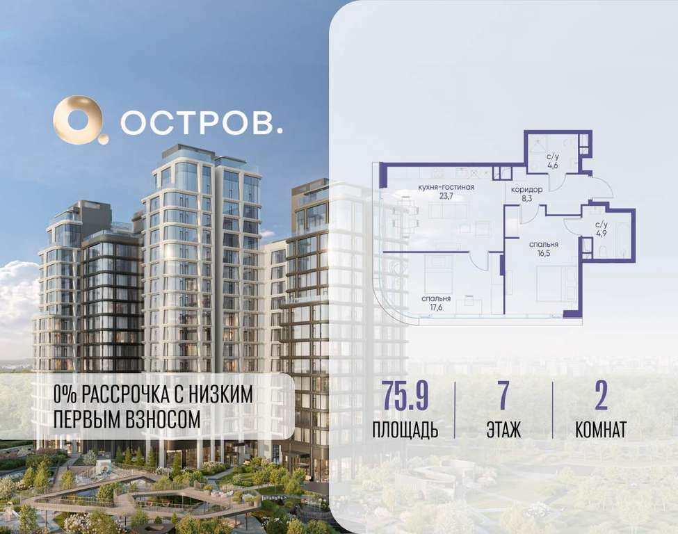 Продаётся 2-комн. квартира от застройщика: общая площадь 75.90 м, жилая 34.10 м, кухня 23.70 м, 7-й этаж, жилой квартал «Остров 12», корпус 6 (секция 1) . Срок сдачи: 1 квартал 2029 года.