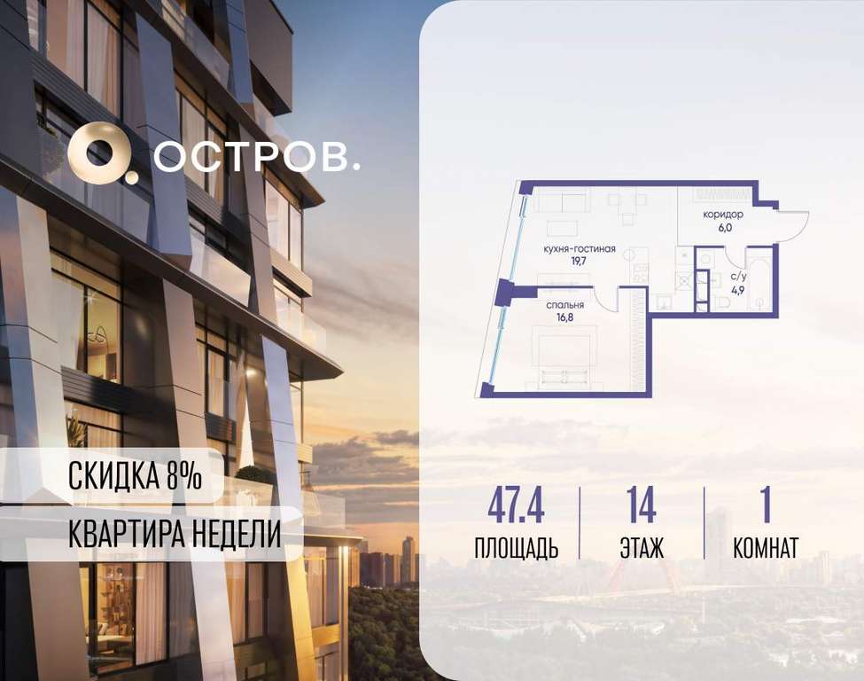 ОСТРОВ от Донстрой - жилой комплекс на западе Москвы, в Мневниковской пойме. Уникальное преимущество комплекса - в том, что он обособлен от города рекой и природным парком (650 га) . Благодаря природному окружению эта территория имеет лучший экологический рейтинг в столице. Кварталы ОСТРОВА объединены ландшафтным дизайном в единое пространство - с набережными и Центральным бульваром. На ОСТРОВЕ любые объекты, необходимые для полноценной жизни и отдыха, находятся на расстоянии 15-минутной прогулки. Торговый центр и супермаркеты, кафе и рестораны, фитнес, салоны красоты, школы и детские сады. А также крупнейший в Москве спортивный кластер.