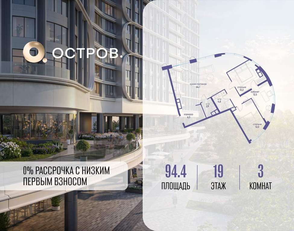 ОСТРОВ от Донстрой - жилой комплекс на западе Москвы, в Мневниковской пойме. Уникальное преимущество комплекса - в том, что он обособлен от города рекой и природным парком (650 га) . Благодаря природному окружению эта территория имеет лучший экологический рейтинг в столице. Кварталы ОСТРОВА объединены ландшафтным дизайном в единое пространство - с набережными и Центральным бульваром. На ОСТРОВЕ любые объекты, необходимые для полноценной жизни и отдыха, находятся на расстоянии 15-минутной прогулки. Торговый центр и супермаркеты, кафе и рестораны, фитнес, салоны красоты, школы и детские сады. А также крупнейший в Москве спортивный кластер.