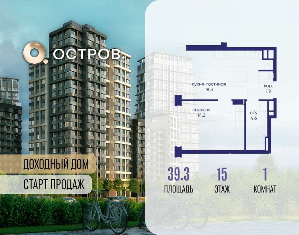 Продаётся 1-комн. квартира от застройщика: общая площадь 39.30 м, жилая 14.20 м, кухня 18.70 м, 15-й этаж, жилой квартал «Остров 14», корпус 1 (секция 2) . Срок сдачи: 2 квартал 2029 года.