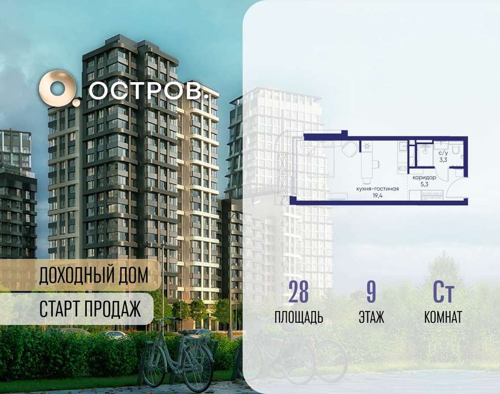 Продаётся квартира от застройщика: общая площадь 28.00 м, жилая 14.40 м, кухня 5.00 м, 9-й этаж, жилой квартал «Остров 14», корпус 1 (секция 2) . Срок сдачи: 2 квартал 2029 года.