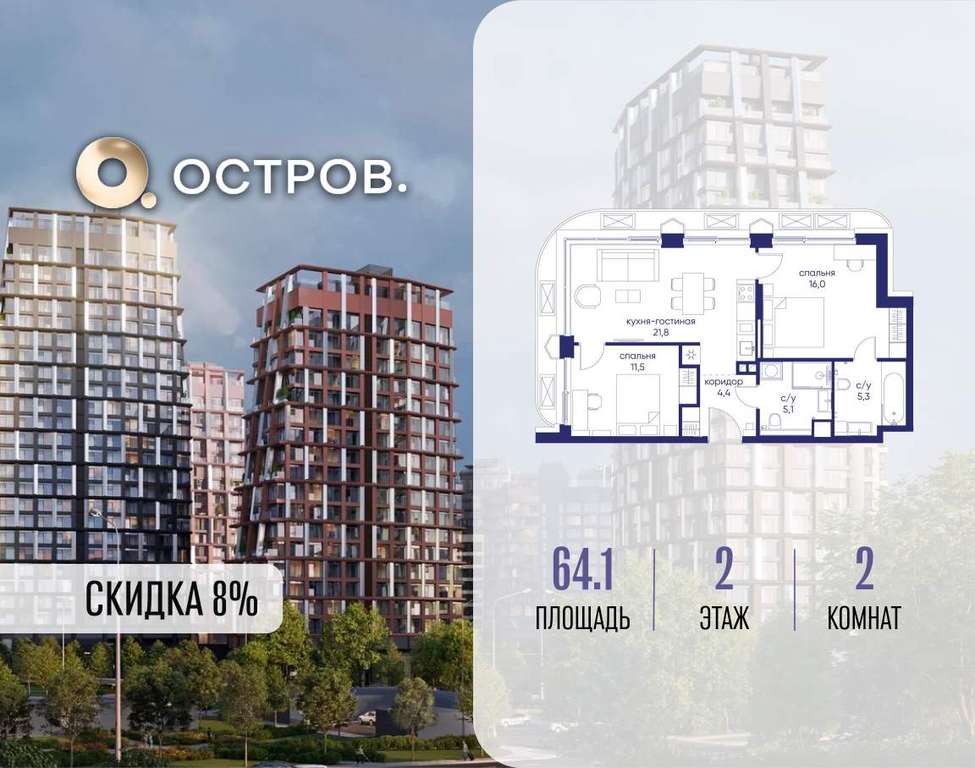 Продаётся 2-комн. квартира от застройщика: общая площадь 64.10 м, жилая 27.50 м, кухня 21.80 м, 2-й этаж, жилой квартал «Остров 14», корпус 1 (секция 2) . Срок сдачи: 2 квартал 2029 года.