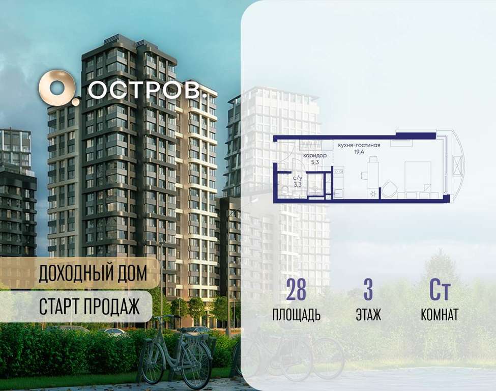 Продаётся квартира от застройщика: общая площадь 28.00 м, жилая 14.40 м, кухня 5.00 м, 3-й этаж, жилой квартал «Остров 14», корпус 1 (секция 2) . Срок сдачи: 2 квартал 2029 года.
