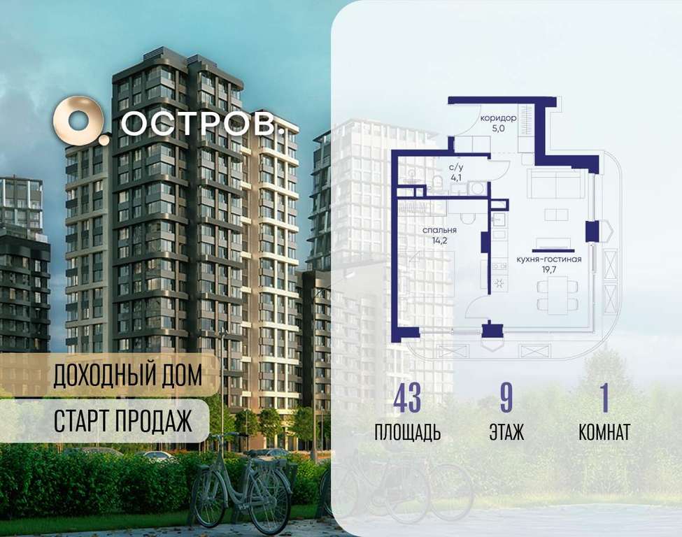 Продаётся 1-комн. квартира от застройщика: общая площадь 43.00 м, жилая 14.20 м, кухня 19.70 м, 9-й этаж, жилой квартал «Остров 14», корпус 1 (секция 2) . Срок сдачи: 2 квартал 2029 года.