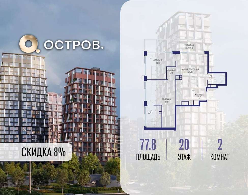 Продаётся 2-комн. квартира от застройщика: общая площадь 77.80 м, жилая 32.90 м, кухня 25.80 м, 20-й этаж, жилой квартал «Остров 14», корпус 6 (секция 1) . Срок сдачи: 2 квартал 2029 года.
