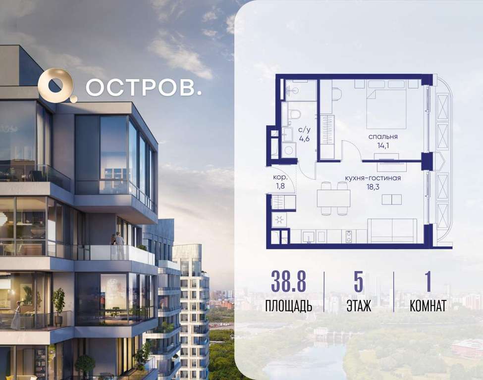 Продаётся 1-комн. квартира от застройщика: общая площадь 38.80 м, жилая 14.10 м, кухня 18.30 м, 5-й этаж, жилой квартал «Остров 14», корпус 1 (секция 2) . Срок сдачи: 2 квартал 2029 года.