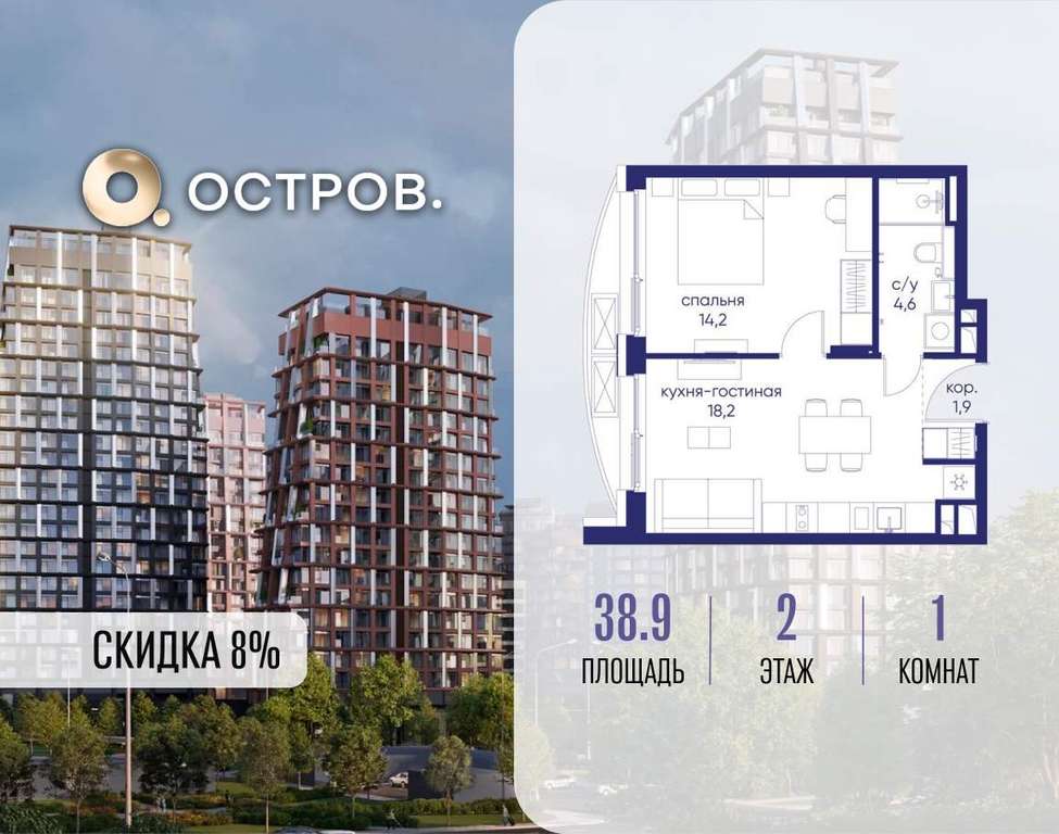 Продаётся 1-комн. квартира от застройщика: общая площадь 38.90 м, жилая 14.20 м, кухня 18.20 м, 2-й этаж, жилой квартал «Остров 14», корпус 1 (секция 2) . Срок сдачи: 2 квартал 2029 года.
