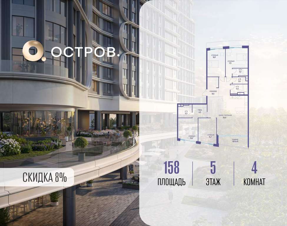 Продаётся 4-комн. квартира от застройщика: общая площадь 158.00 м, жилая 64.90 м, кухня 56.60 м, 5-й этаж, жилой квартал «Остров 7», корпус 4 (секция 3) . Срок сдачи: 1 квартал 2028 года.