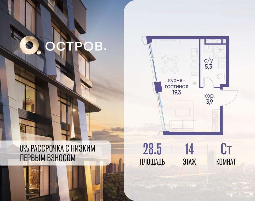 Продаётся квартира от застройщика: общая площадь 28.50 м, жилая 10.00 м, кухня 9.30 м, 14-й этаж, жилой квартал «Остров 12», корпус 3 (секция 1) . Срок сдачи: 1 квартал 2029 года.