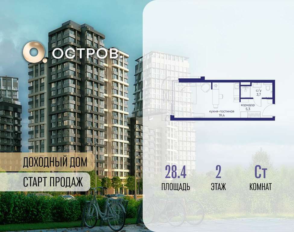 Продаётся квартира от застройщика: общая площадь 28.40 м, жилая 14.40 м, кухня 5.00 м, 2-й этаж, жилой квартал «Остров 14», корпус 1 (секция 1) . Срок сдачи: 2 квартал 2029 года.