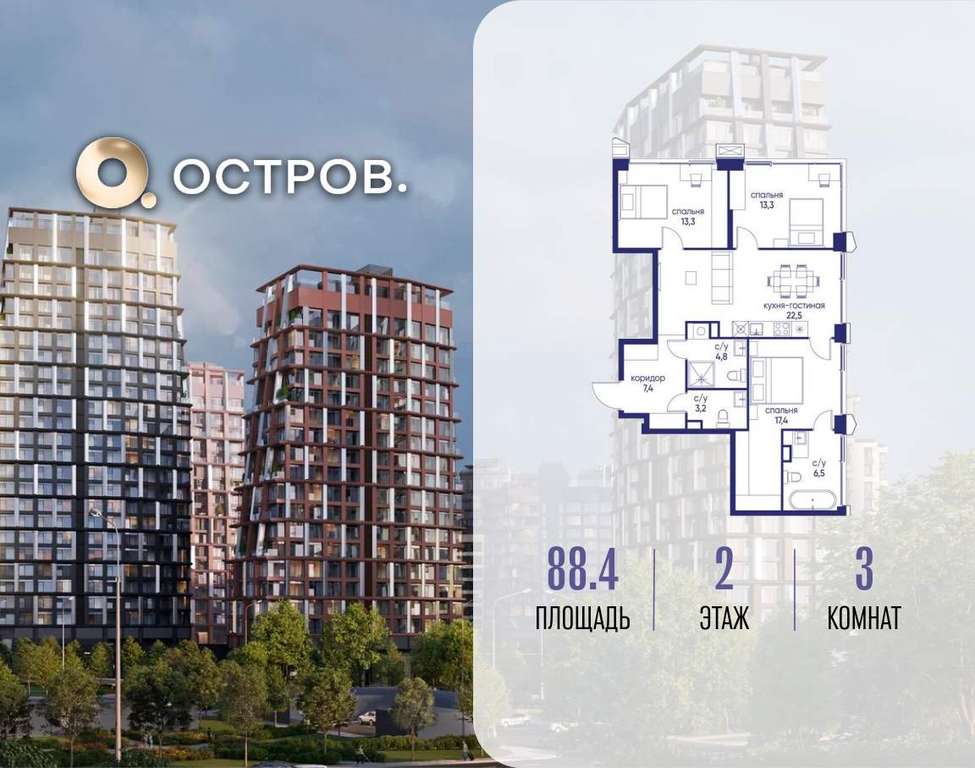 Продаётся 3-комн. квартира от застройщика: общая площадь 88.40 м, жилая 26.60 м, кухня 22.50 м, 2-й этаж, жилой квартал «Остров 14», корпус 4 (секция 1) . Срок сдачи: 2 квартал 2029 года.
