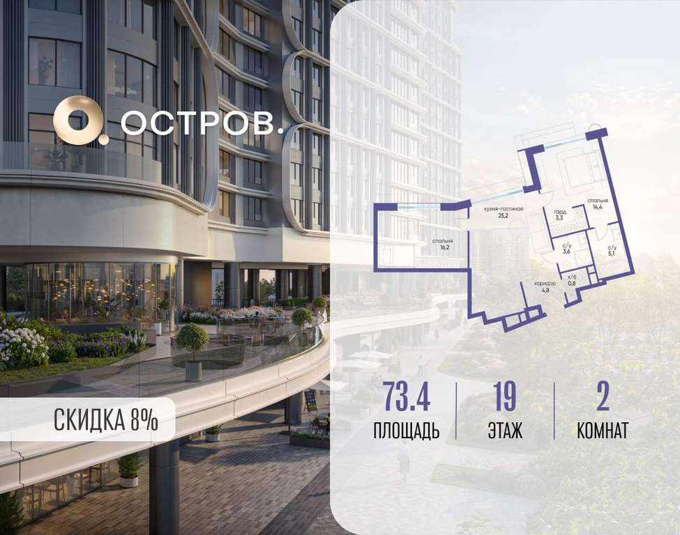 Продаётся 2-комн. квартира от застройщика: общая площадь 73.40 м, жилая 30.60 м, кухня 25.20 м, 19-й этаж, жилой квартал «Остров 7», корпус 7 (секция 2) . Срок сдачи: 3 квартал 2028 года.