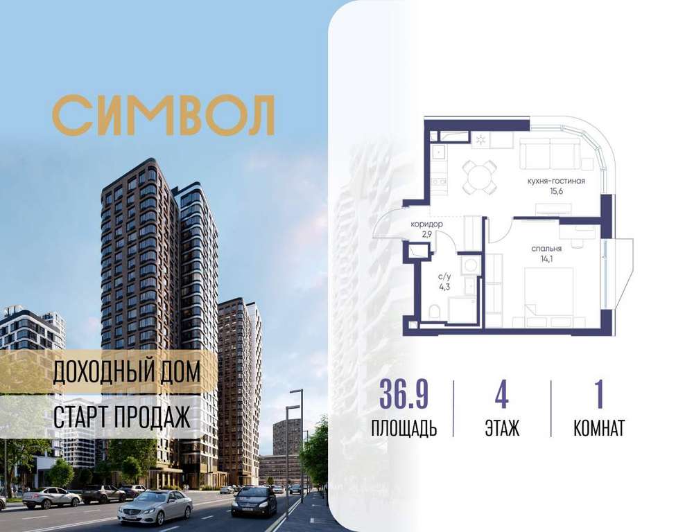 Продается 1-комнатная квартира от застройщика: общая площадь 36.90 м, жилая 14.10 м, кухня 15.60 м, 4-й этаж, жилой квартал «Гордость», корпус 40 (секция 1) . Срок сдачи: 2 квартал 2029 года.